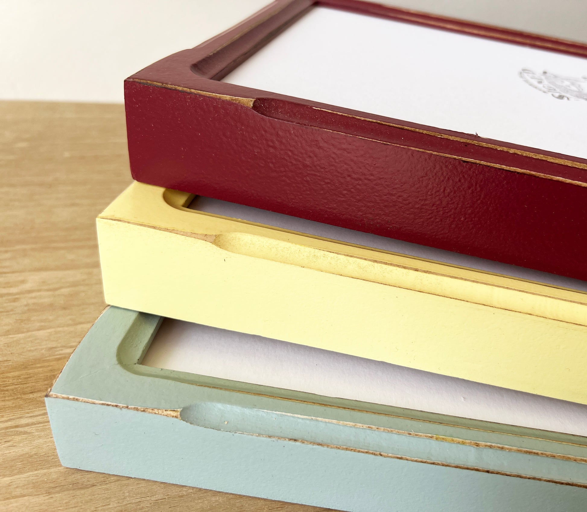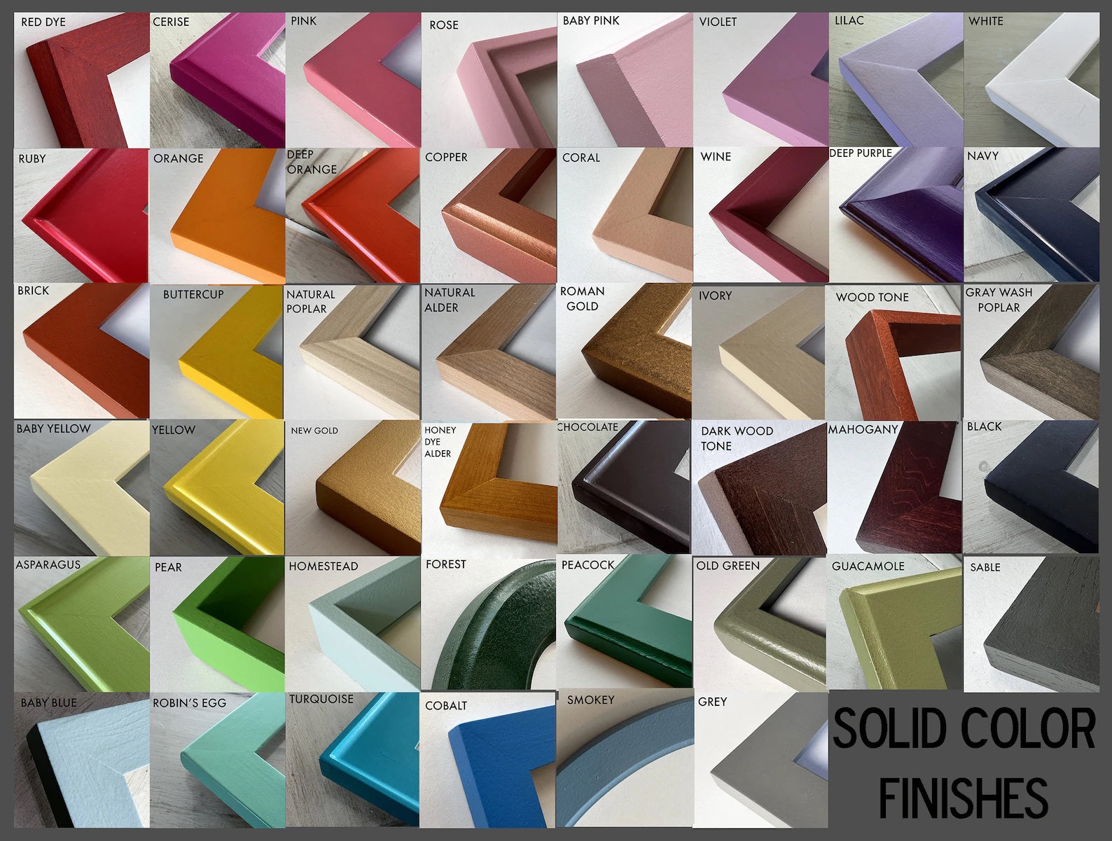 We take pride in the fact that our frames are built using environmentally-friendly materials from local vendors, we primarily use poplar and hardwood for our painted frames and have recently introduced more specialty woods.